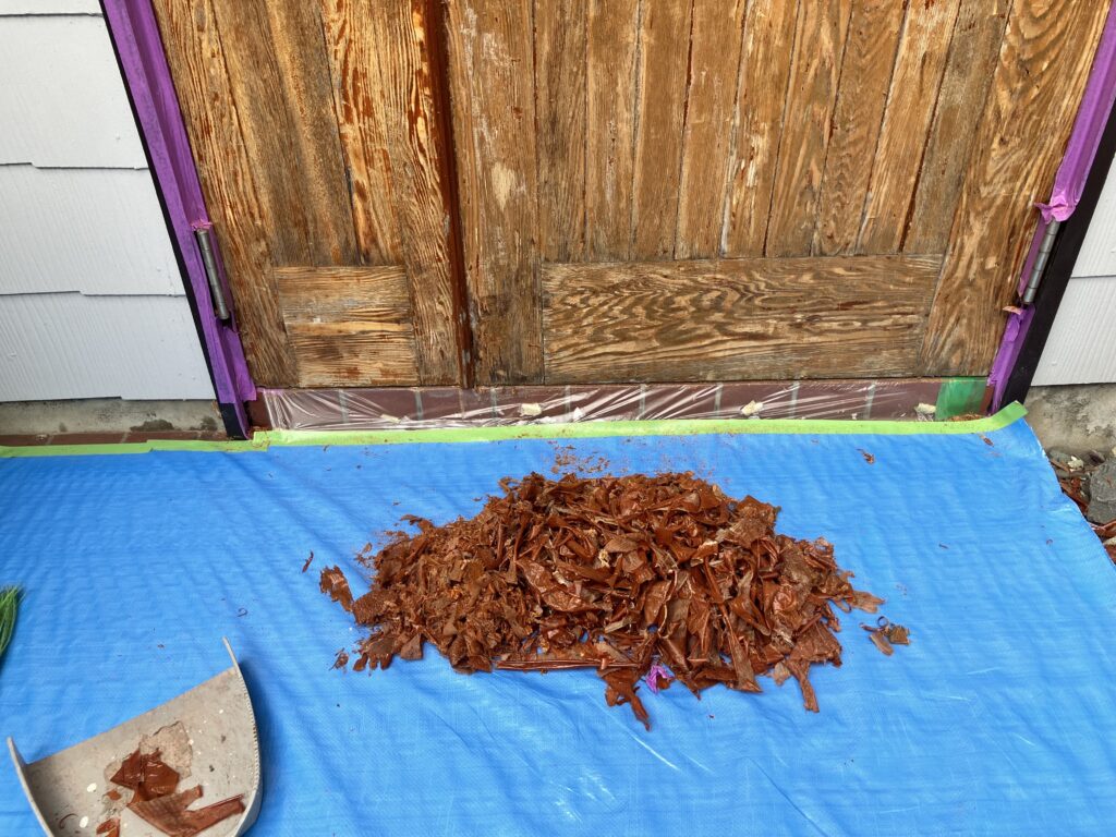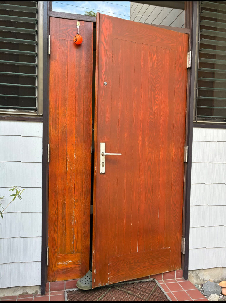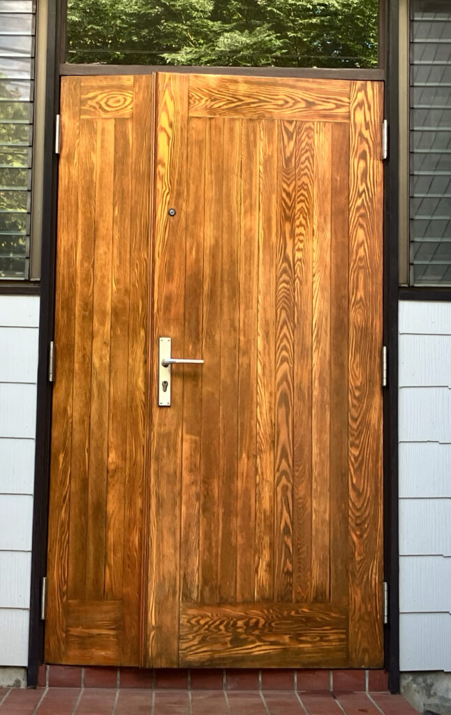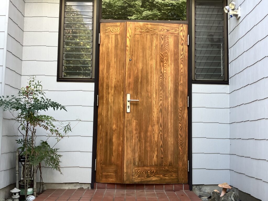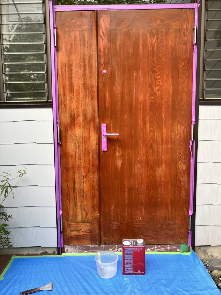 元々は木目がとても素敵なドアだったようですが、前回のメンテナンスの際に木目を生かさず塗りつぶしてしまった為、元の姿に戻して欲しいと言うご依頼でした。
